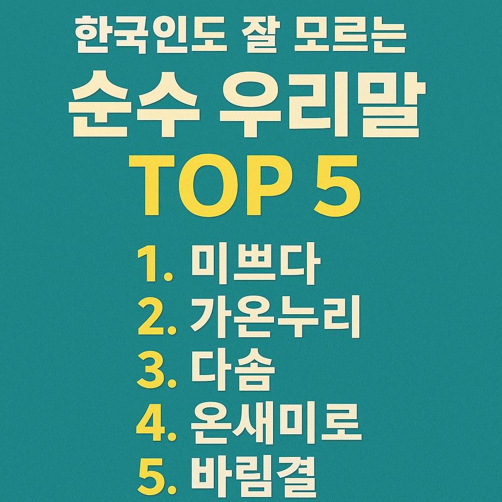 우리가 매일 사용하는 한국어 속에는 아름답고도 정겨운 순수 우리말이 많이 숨어 있습니다. 하지만 외래어와 한자어가 섞여 사용되는 오늘날, 정작 우리말의 진짜 매력을 놓치고 있지는 않을까요? 이번 글에서는 한국인도 잘 모르는 순수 우리말 5가지를 소개하고, 그 뜻과 아름다움을 함께 느껴보려 합니다.